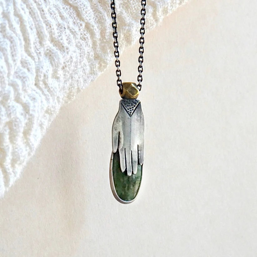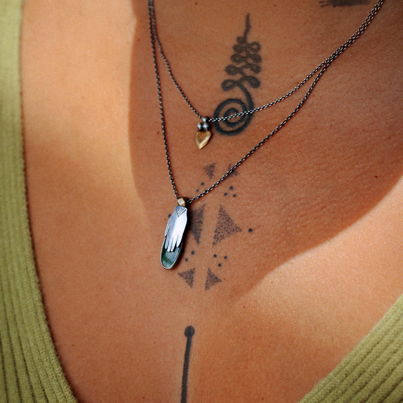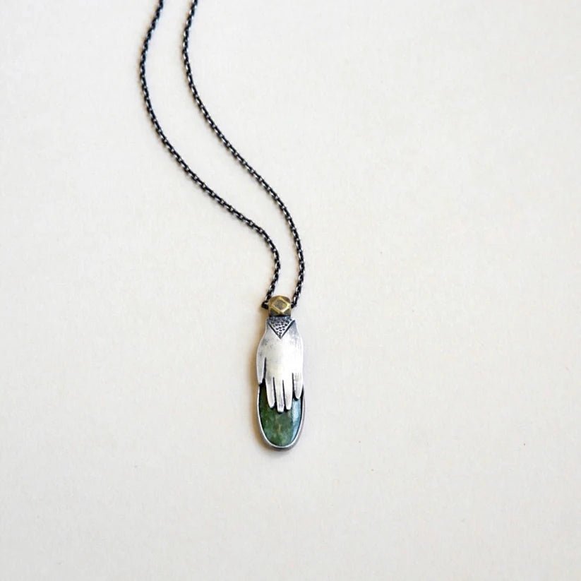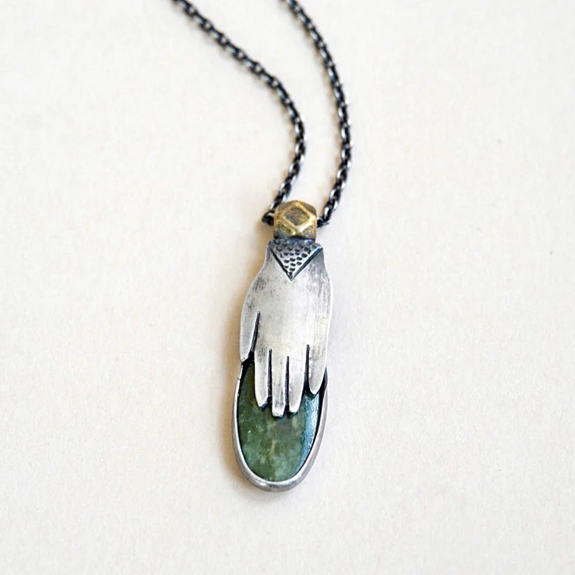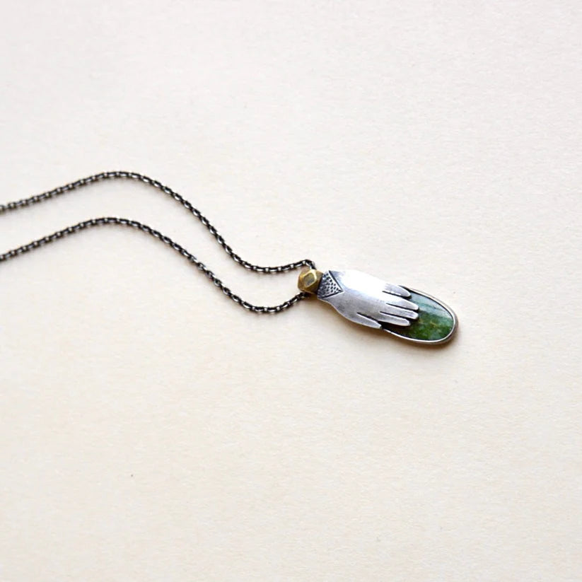 Hand Milagro Necklace - Oxidized Sterling Silver, Brass + Jade Gemstone