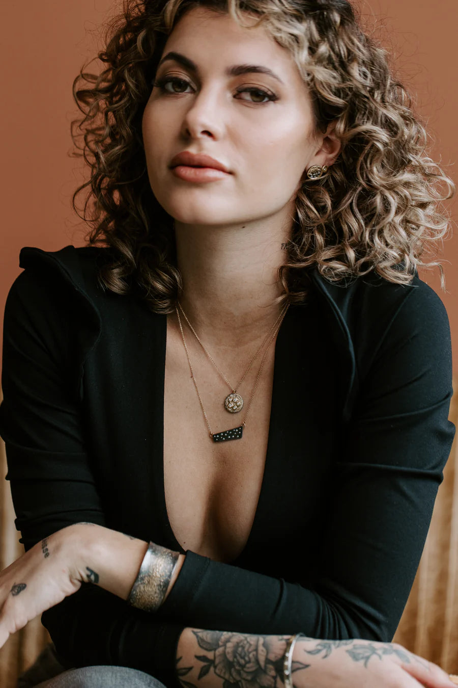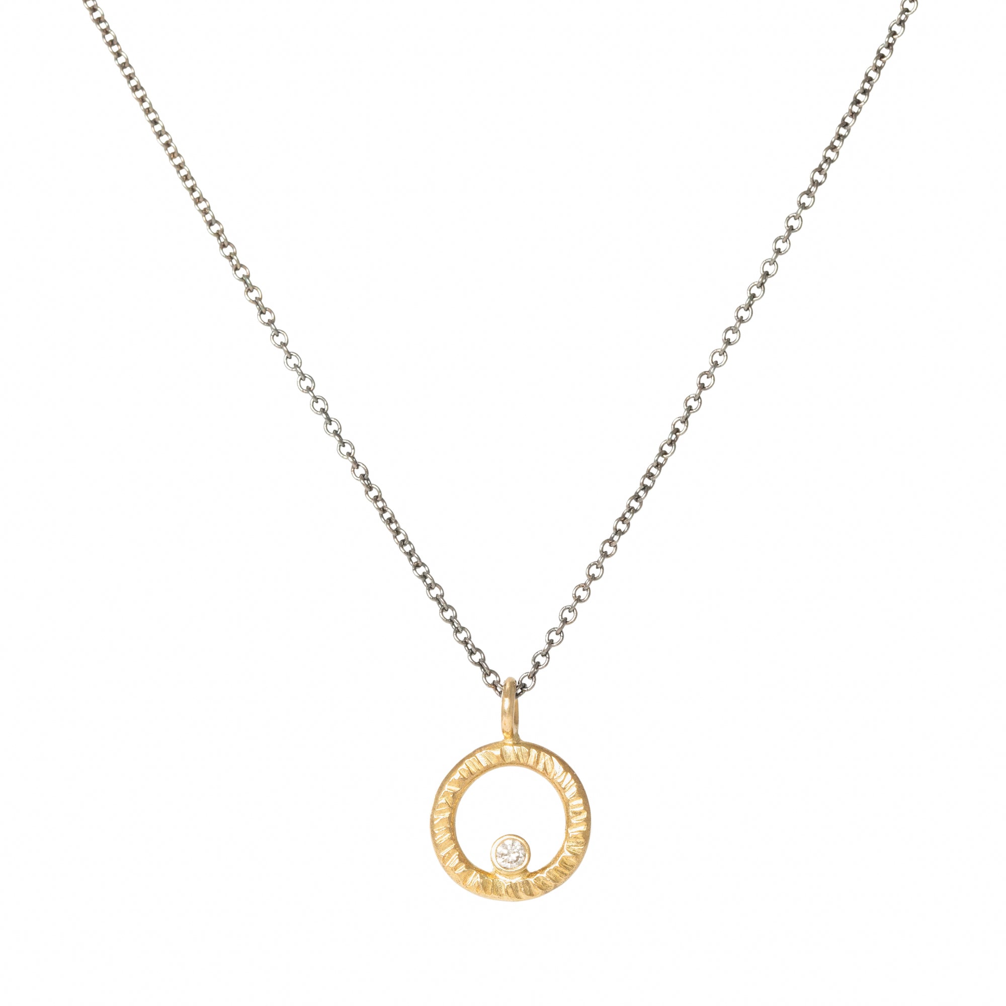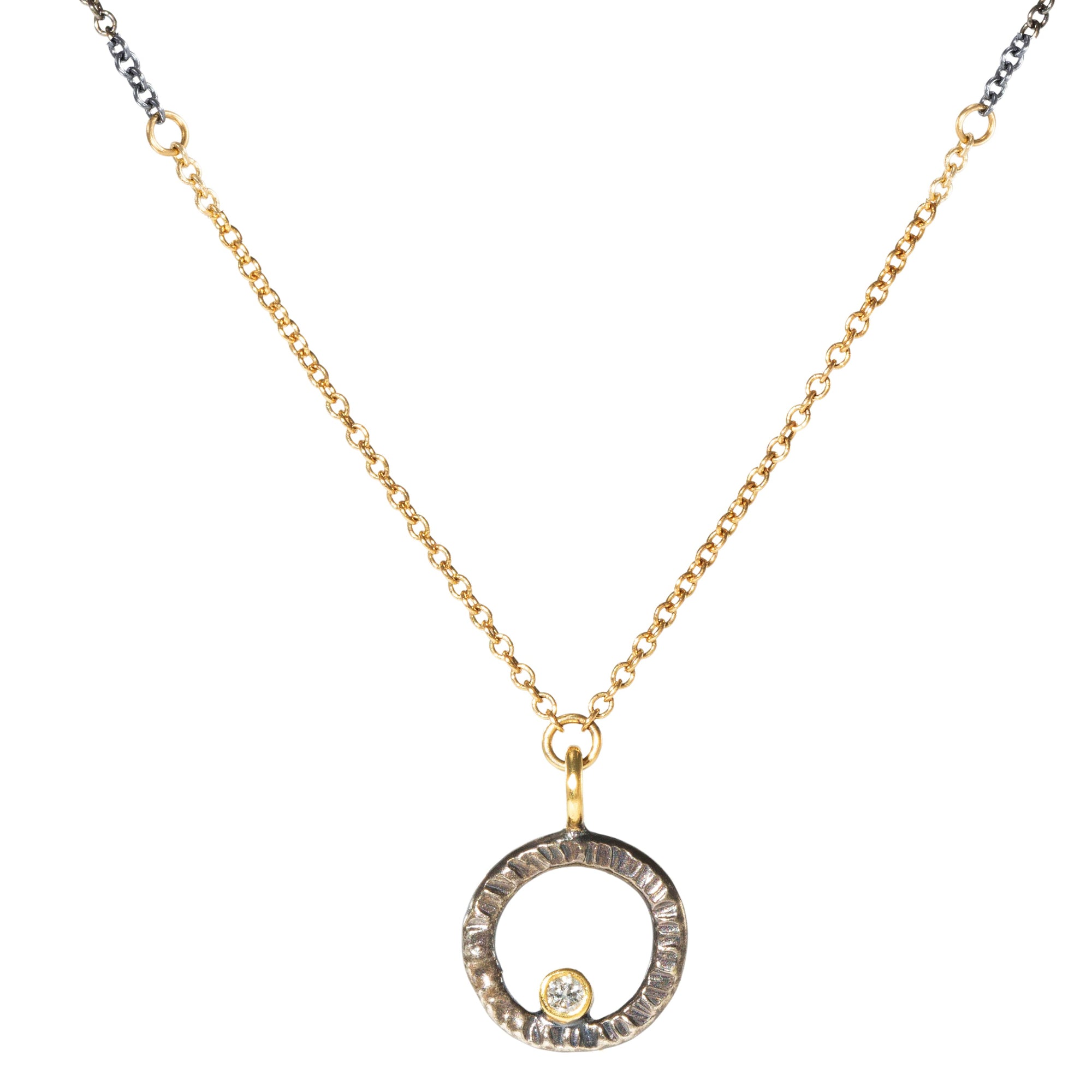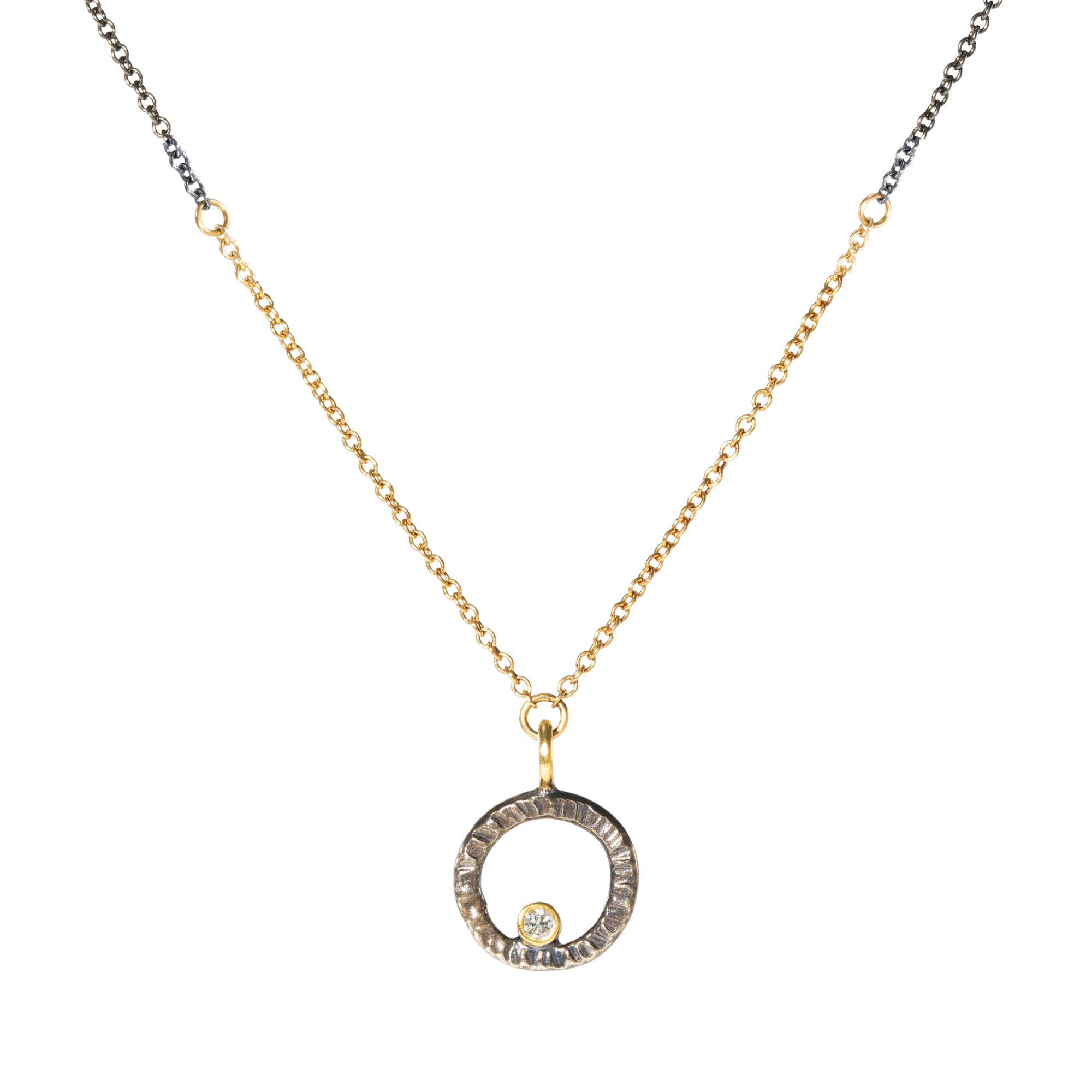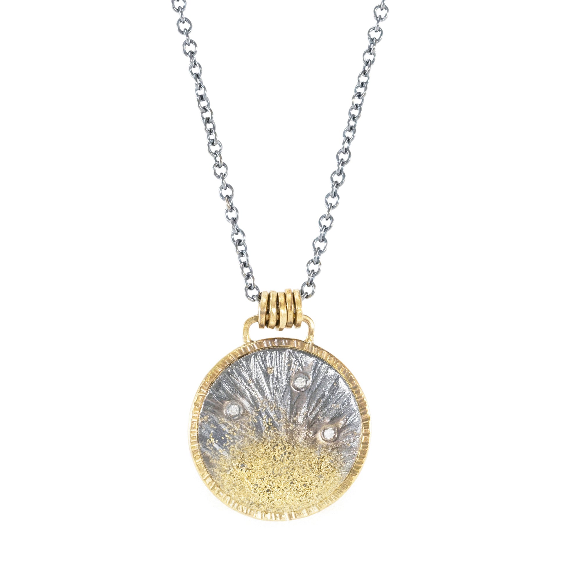 Black + Gold Disc Necklace on Two-Tone Chain - 14k Gold, Oxidized Silver + VS White Diamonds