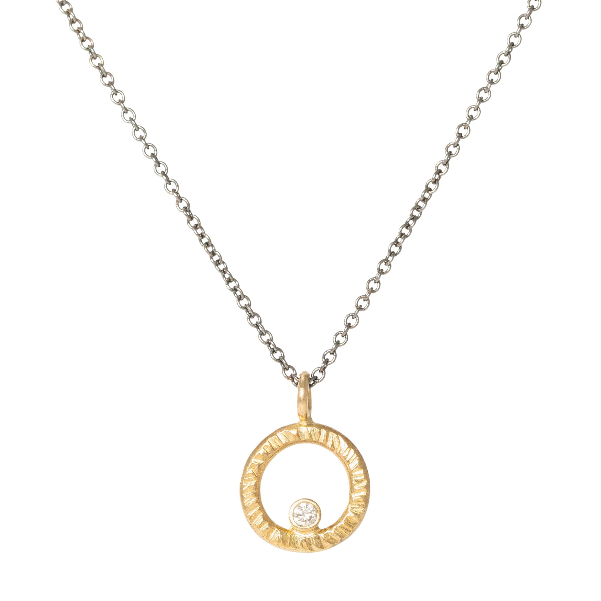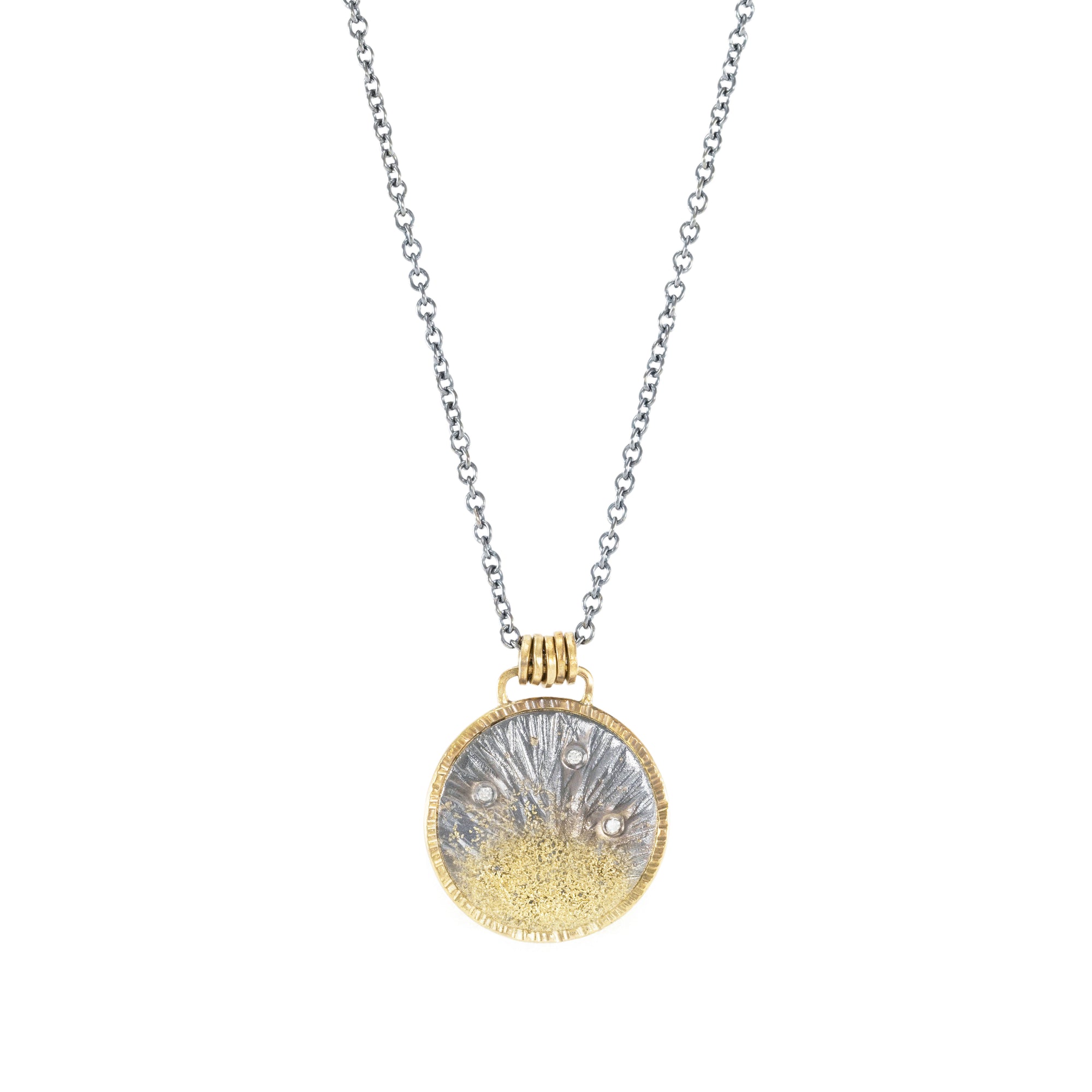 Sun Rays Round Pendant Necklace - 22k/18k/14k Gold, Oxidized Silver + VS White Diamonds