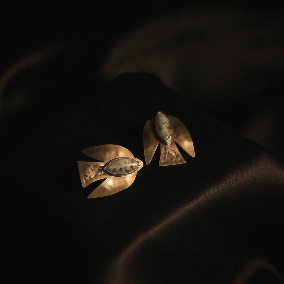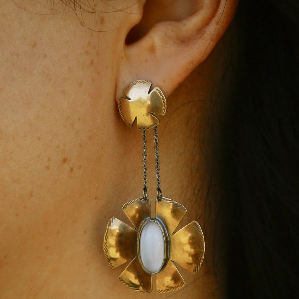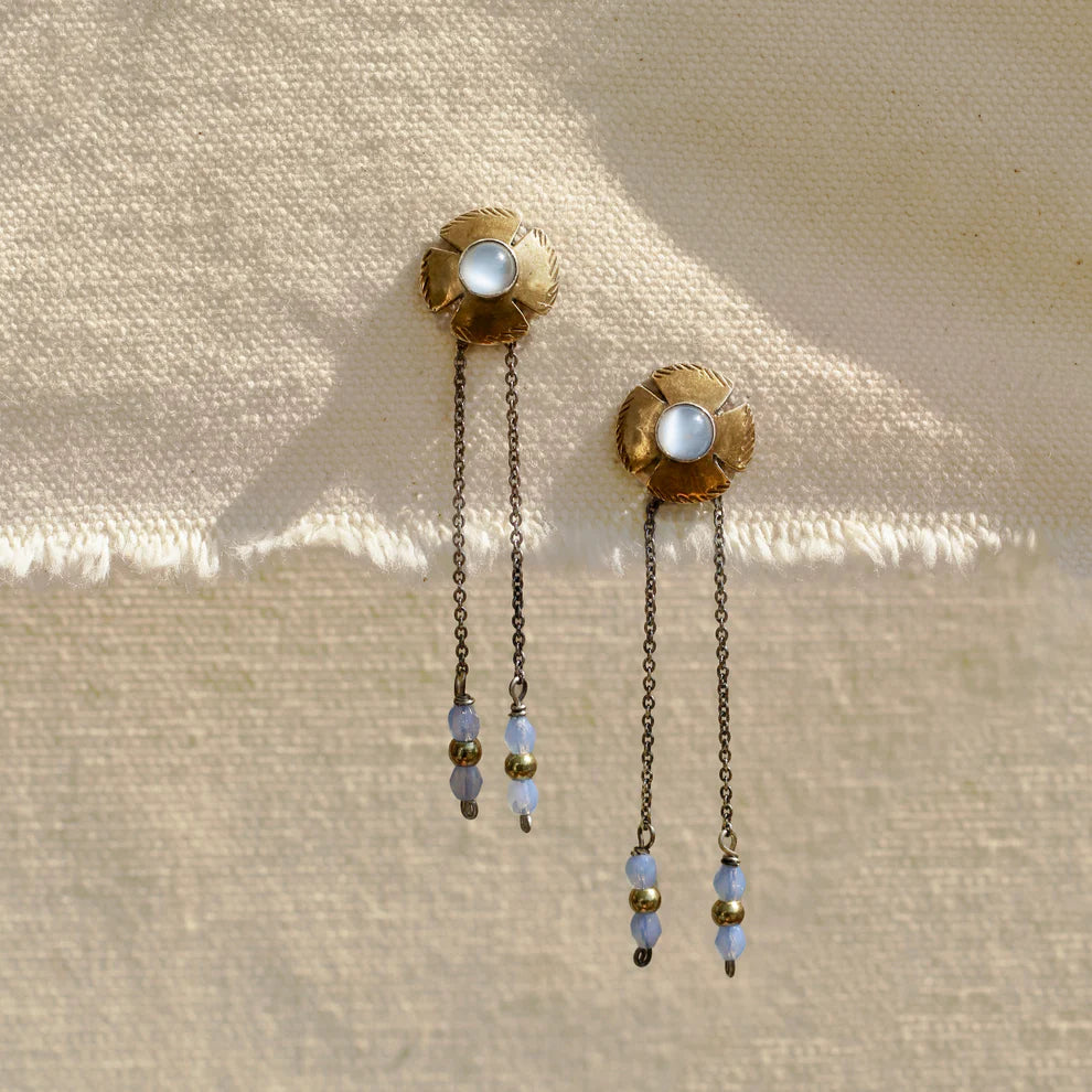 Flora Earrings - Oxidized Brass, Sterling Silver + Blue Moonstone Glass