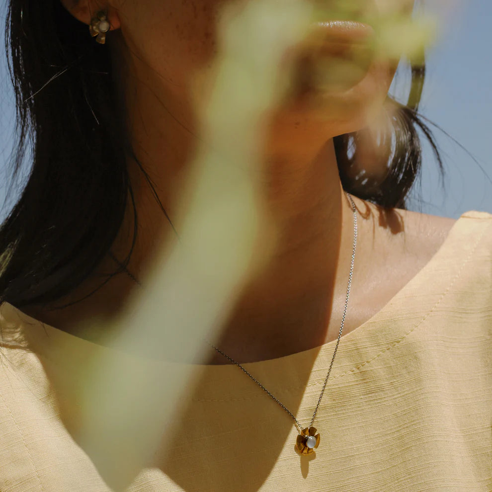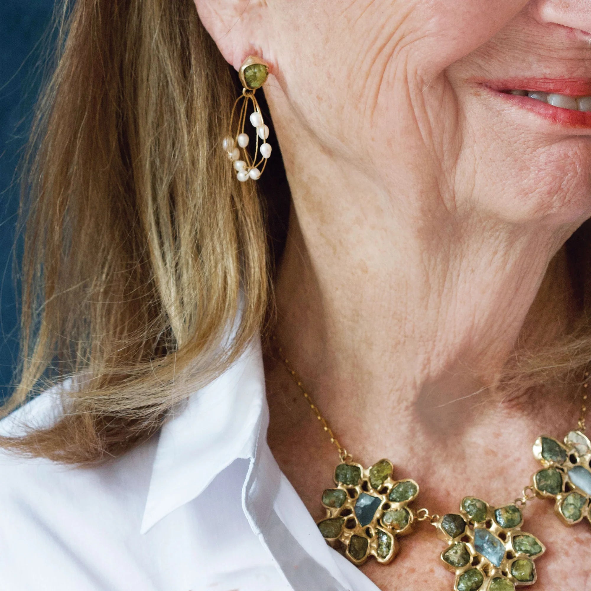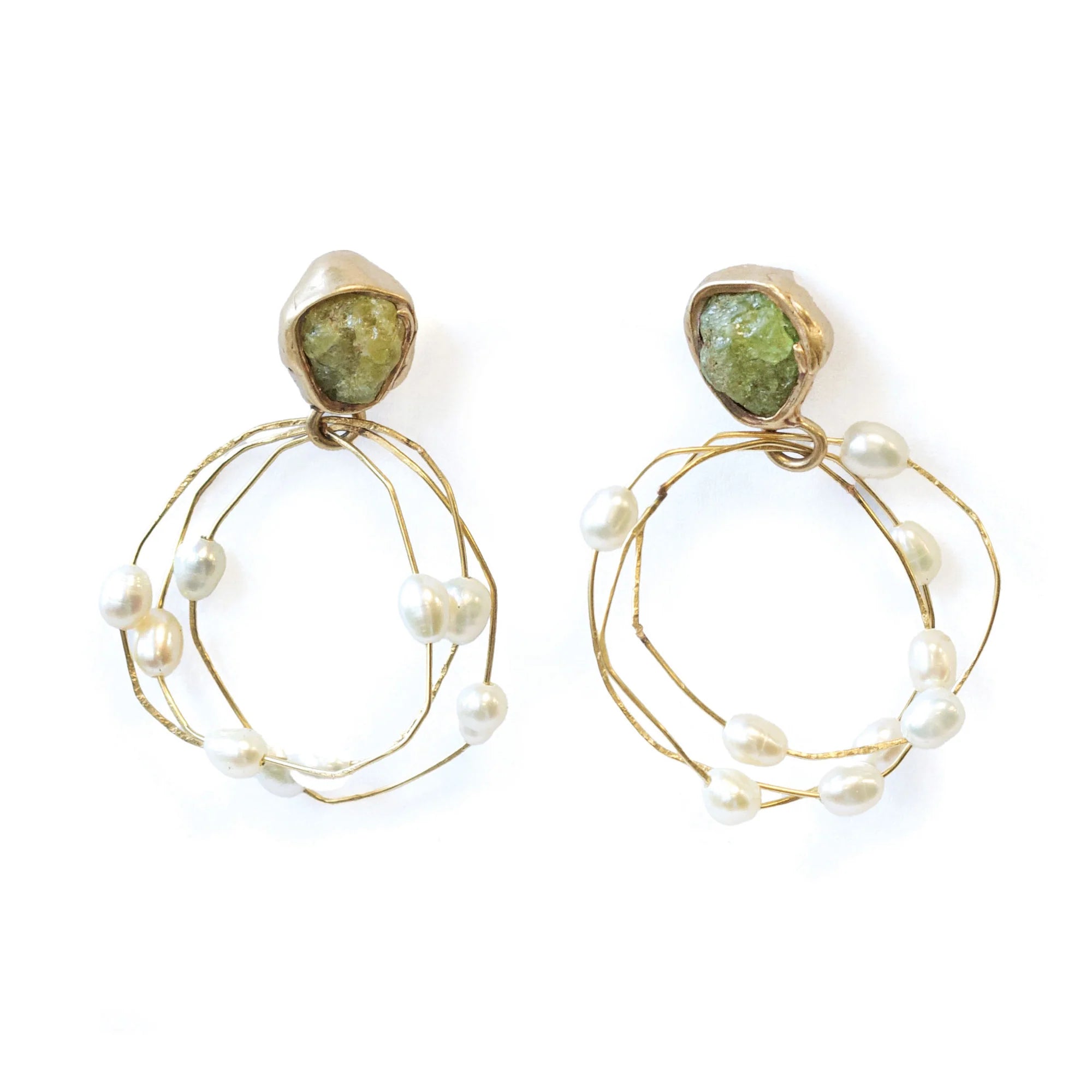 Water Lily Hoops - Brass, Sterling Silver, Green Garnet + Pearl