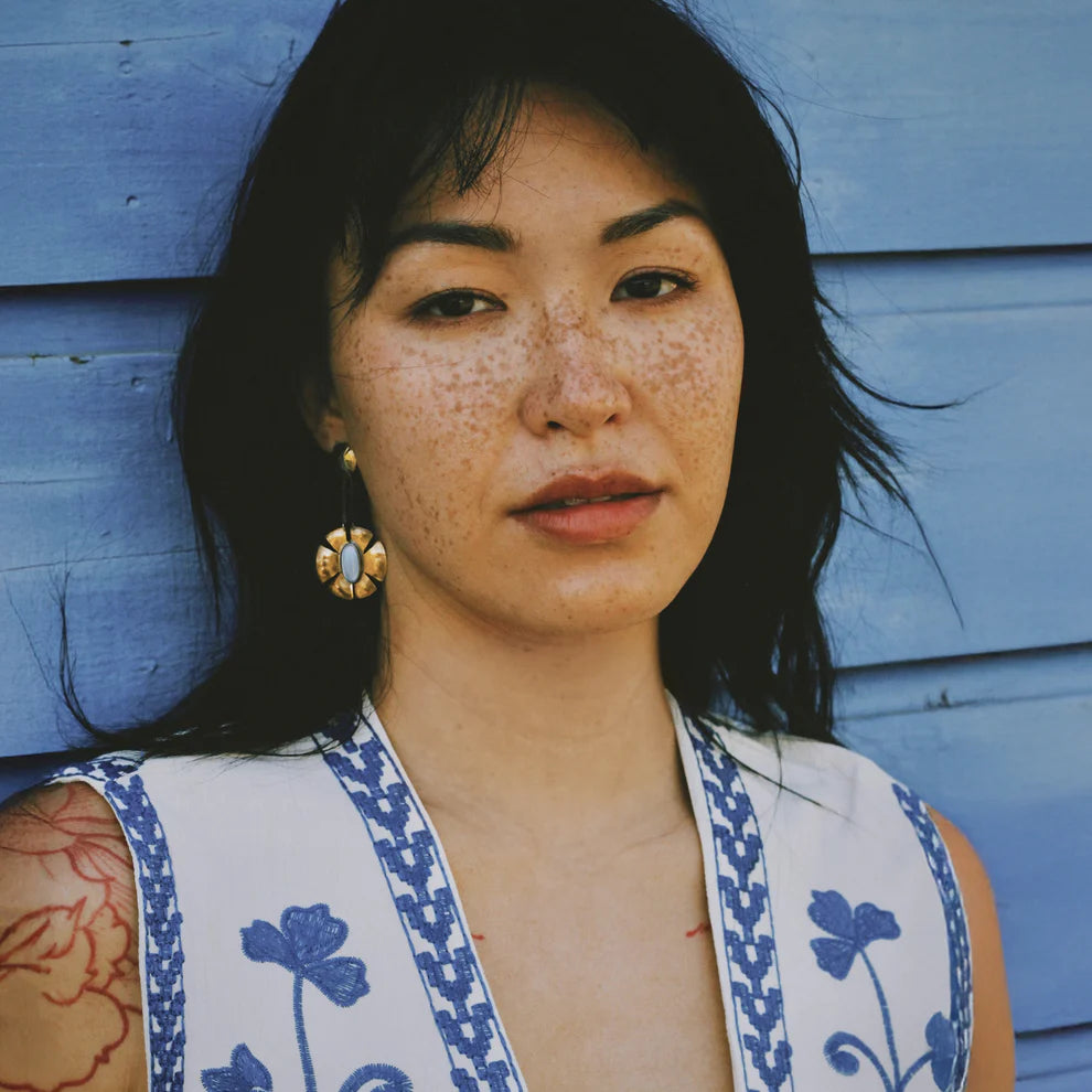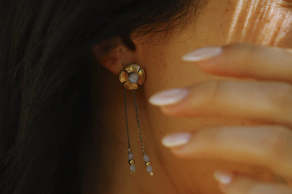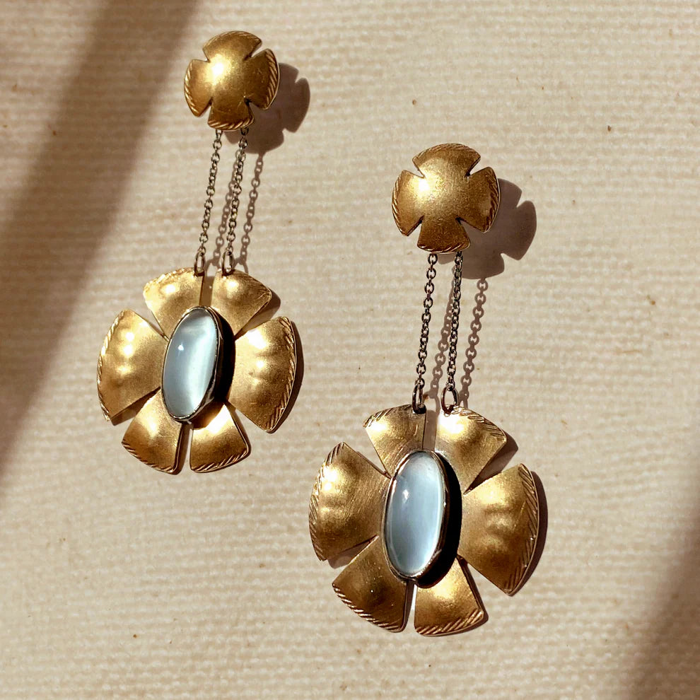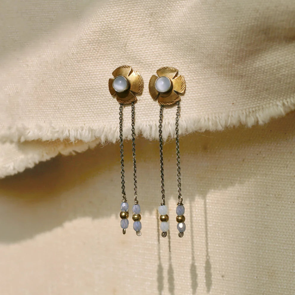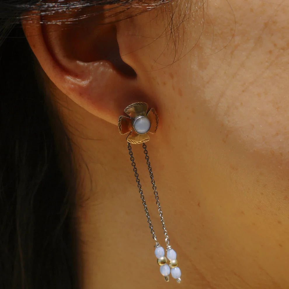 Petite Flora Earrings - Oxidized Brass, Sterling Silver + Blue Moonstone Glass