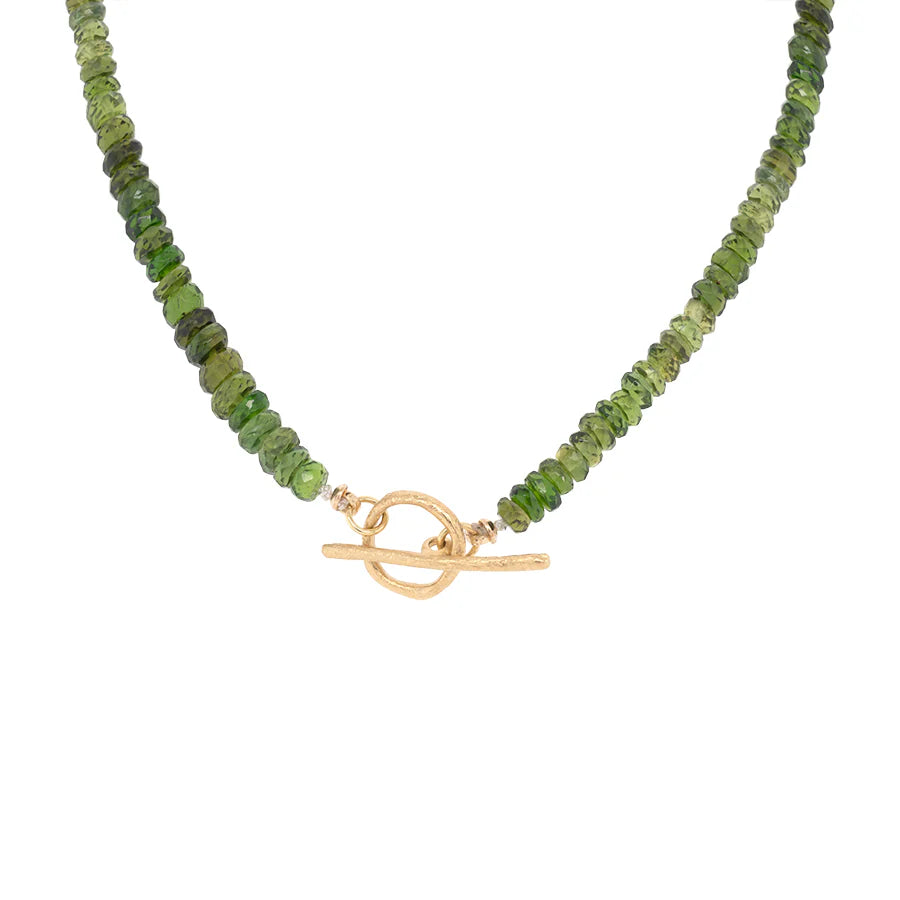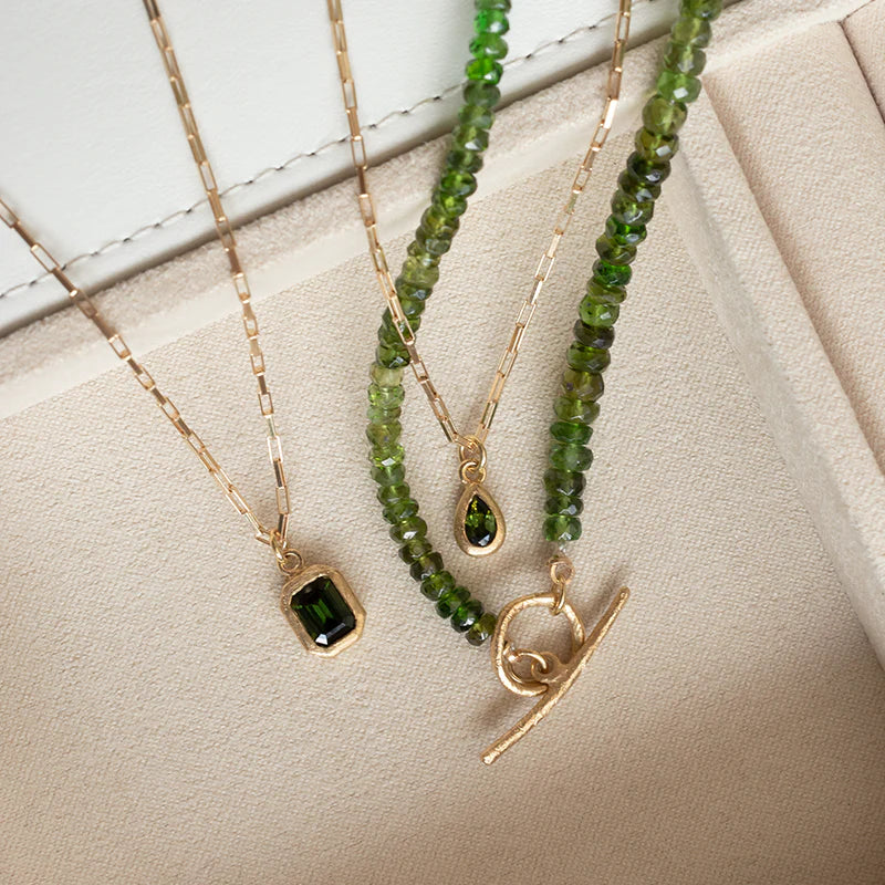 Green Tourmaline Natural Gemstone Boulder Toggle Necklace - 18k Gold + Green Tourmaline