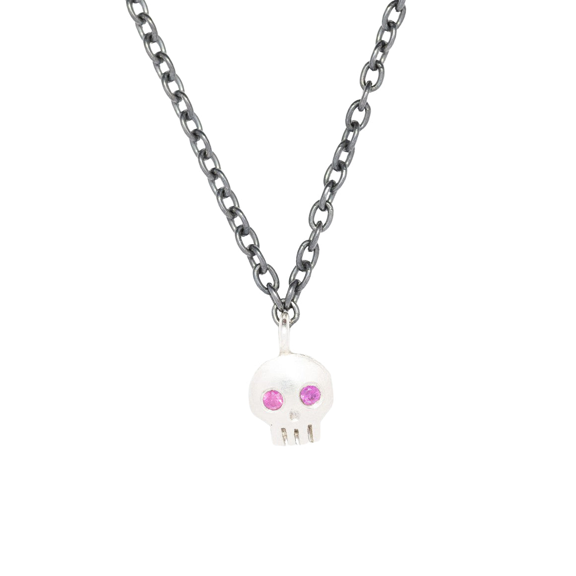Single Skull Necklace - Sterling Silver + Pink Sapphires
