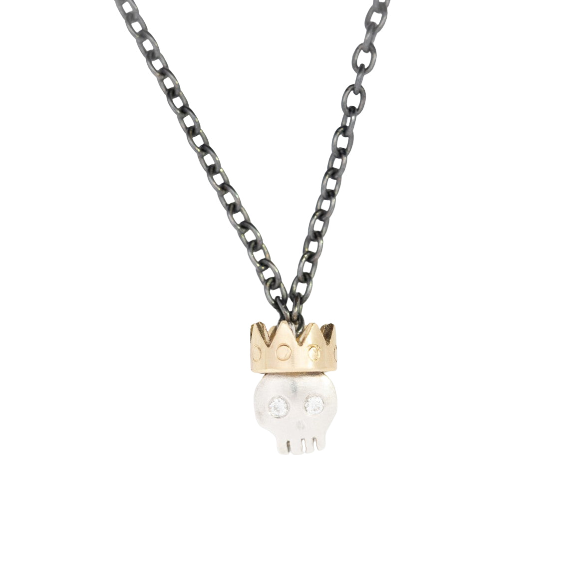 Single Skull Crown Necklace - 18K Gold, Sterling Silver + White Diamonds