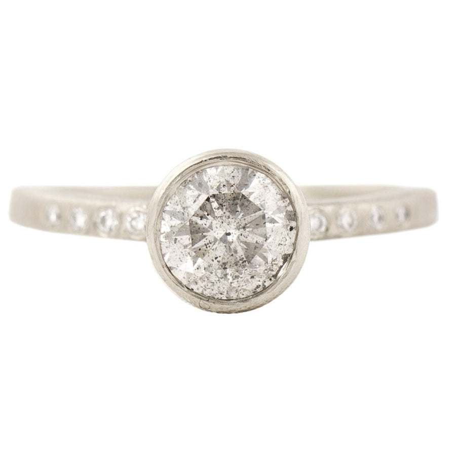 Legacy Diamond Ring - Salt + Pepper Brilliant Cut Diamond set in 14kpw Gold with a Smooth Bezel + Flush Set VS side Diamonds